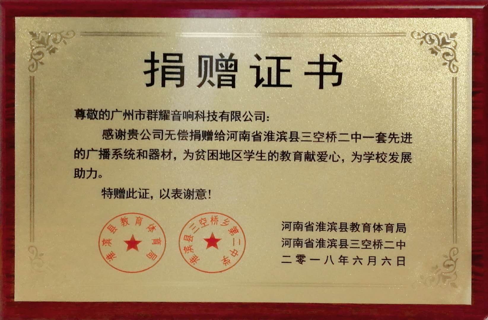 记者了解到,本次为该校捐助的企业,是广州市一家名为群耀音响科技的公司。